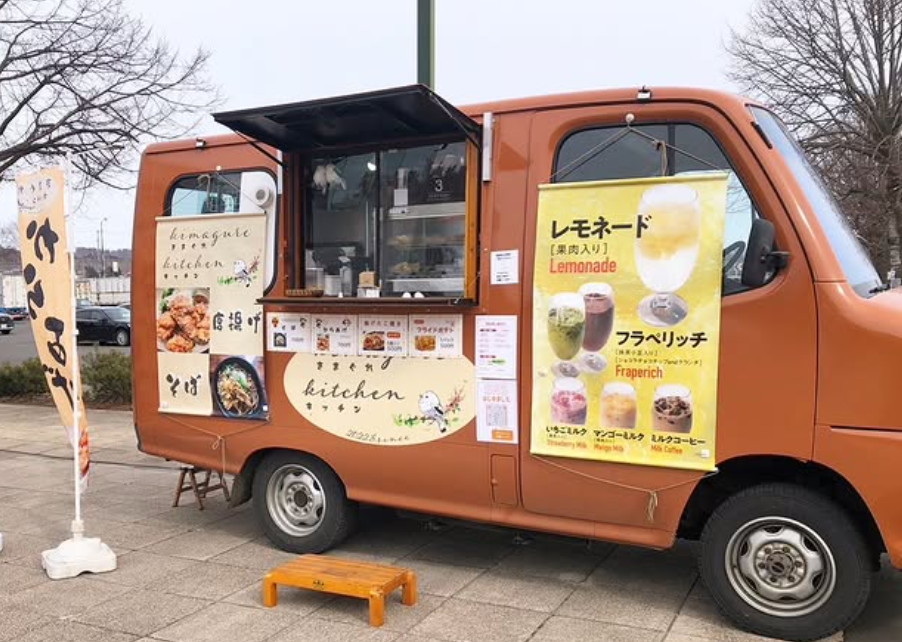 唐揚げや蕎麦、ポテトなどを販売しているキッチンカー。企業へのランチ出店にも対応しています。